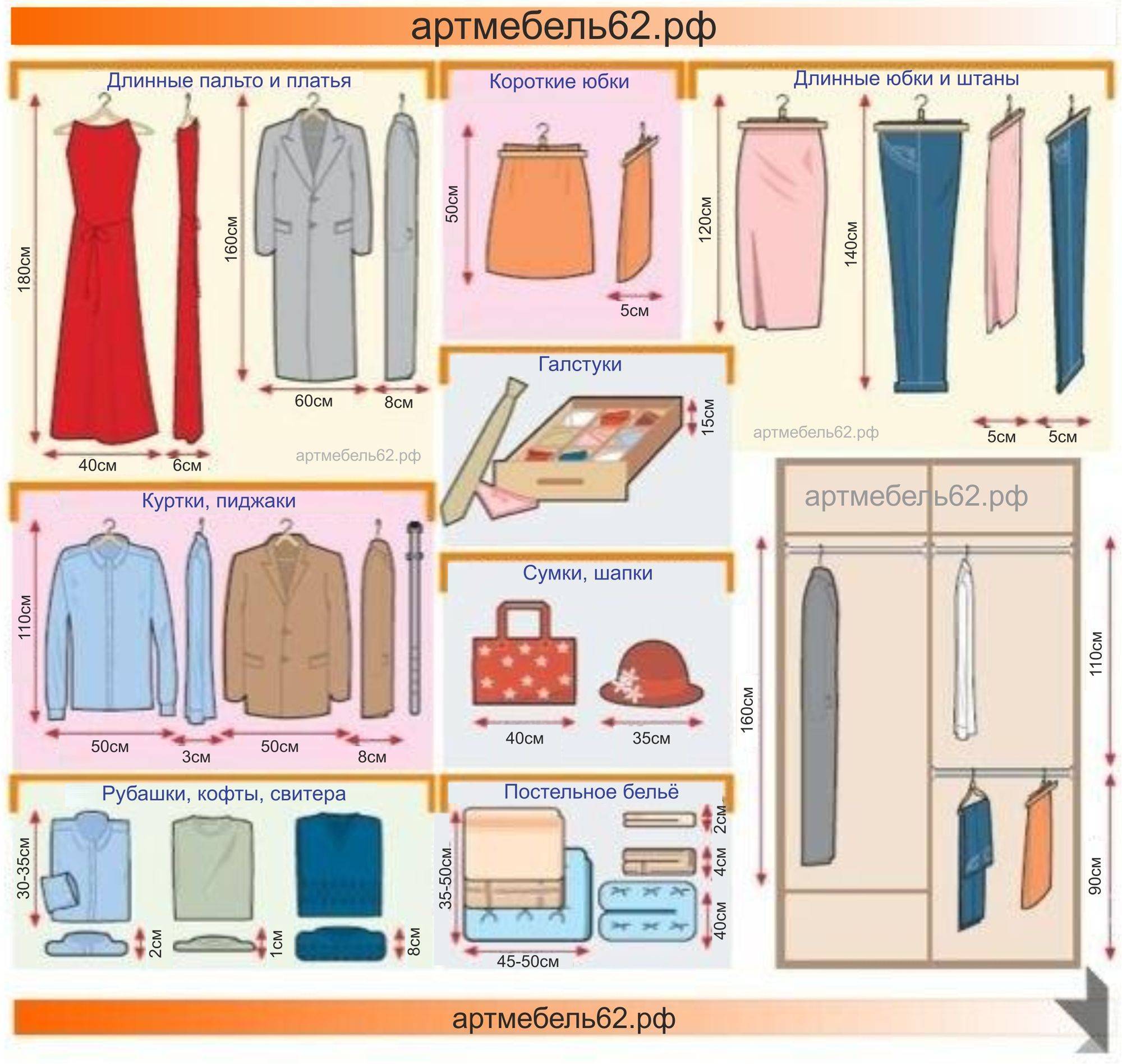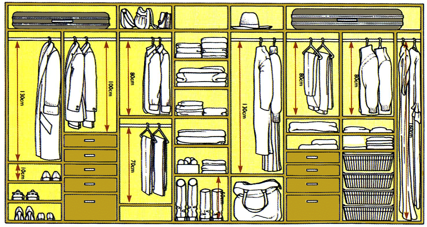 Для верхней одежды: пальто, плащи, шубы высота шкафа не должна быть меньше 140 см. Ригель (он служит держателем вешалок) практичнее всего располагать не вглубь шкафа, а поперек.