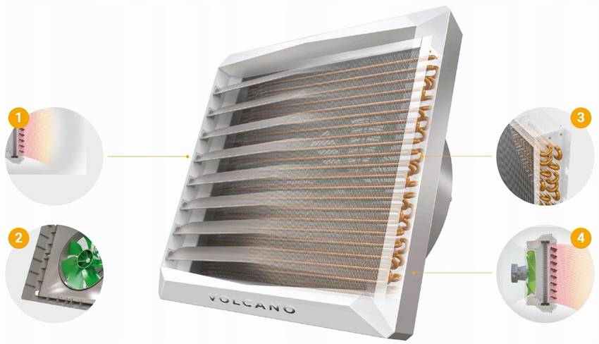 Строение калорифера Volcano: 1 — подвижные регулируемые лопатки, 2 — встроенный диффузор с вентилятором, 3 — нагревательные элементы, 4 — подача тёплого воздуха