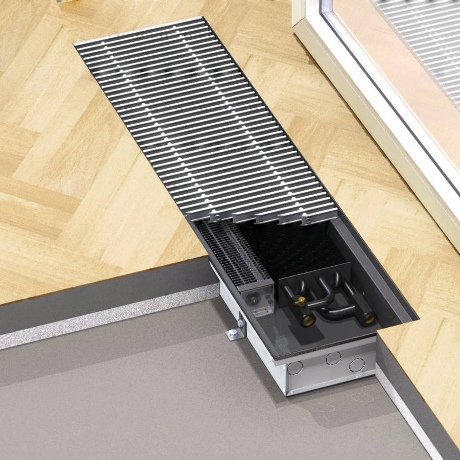Если возникает необходимость обустроить отопительную систему, которую не будет видно, то лучшим вариантом являются внутрипольные водяные конвекторы. Как понятно из названия, данный вид конвекторов устанавливается прямо в пол, в котором сначала подготавливаются соответствующего размера и формы ниши. Под полом монтируется и трубопровод, обеспечивающий подачу теплоносителя отопительным приборам.