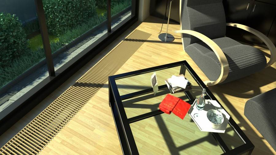 Внутрипольная версия скрывается под его поверхностью, однако, декоративная решетка, через которую отдается тепло, будет видна. Эта версия рекомендуется для сохранения эстетического наполнения комнаты, поскольку она даже украсит помещение.