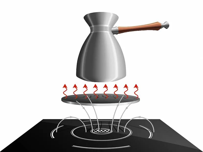 Если заглянуть внутрь кухонной техники, то можно увидеть, что в каждой конфорке имеется индукционная катушка, которая под действием электричества создает магнитное поле. Возникшие переменные токи, проникая сквозь варочную панель, передаются посуде. Именно поэтому дно кухонных принадлежностей, которые ставятся на печь, желательно должны быть из специальных сплавов – это способствует процессу перемагничивания для дальнейшего получения тепла.