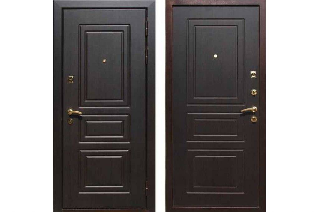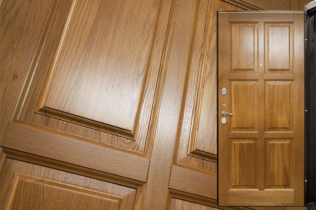МДФ-панель. В отличие от внутренней стороны, с фасадной плоскости двери, такой материал может применяться только при установке изделия в квартире. Структура панели впитывает влагу, что приводит её к разрушению при установке на улице. Как правило, панель имеет выделанную плоскость, имитирует филёнки, а также покрывается высокопрочной цветной ламинированной плёнкой.