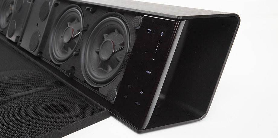 Основная панель дополняется выносным сабвуфером и дополнительными колонками. Благодаря различным конфигурациям при размещении техники пользователь получает чистый и объемный звук.