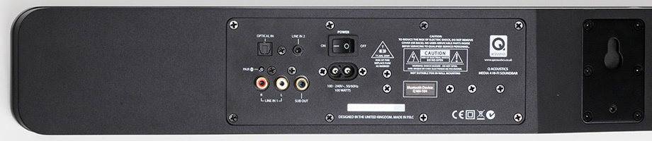 Подход британской компании Q Acoustics к созданию саудбара особый. В то время как многие компании, воспользовавшись удобной возможностью цифровой обработки сигнала, включают всевозможные объемные и частотные «улучшайзеры», Q Acoustics остается верной идее наиболее достоверного воспроизведения звука.Также компания выяснила по статистическим данным, что типичный слушатель старается избежать использования дополнительных устройств и соединений. Поэтому отдельный сабвуфер для модели Media 4 не предлагается, а просто он встроен уже в сам саундбар (впрочем, выход на внешний сабвуфер все же предусмотрен). Конечно, от этого пострадала толщина устройства (142 мм), но его так же несложно разместить на стене, как любой другой саундбар. Используются два BMR-излучателя размером 65х65 мм и один басовый динамик с двойной катушкой и размером 120х150 мм. Распределение мощности усиления соответственно 2х25 Вт + 50 Вт (общая мощность 100 Вт). Звуковой сигнал устройство принимает с линейного входа (разъемы RCA и миниджек), с оптического входа (только PCM) и по соединению Bluetooth 3.0 с поддержкой NFC и кодека aptX (наиболее качественный кодек для iOS и Android устроойств с возможностью управлять громкостью).