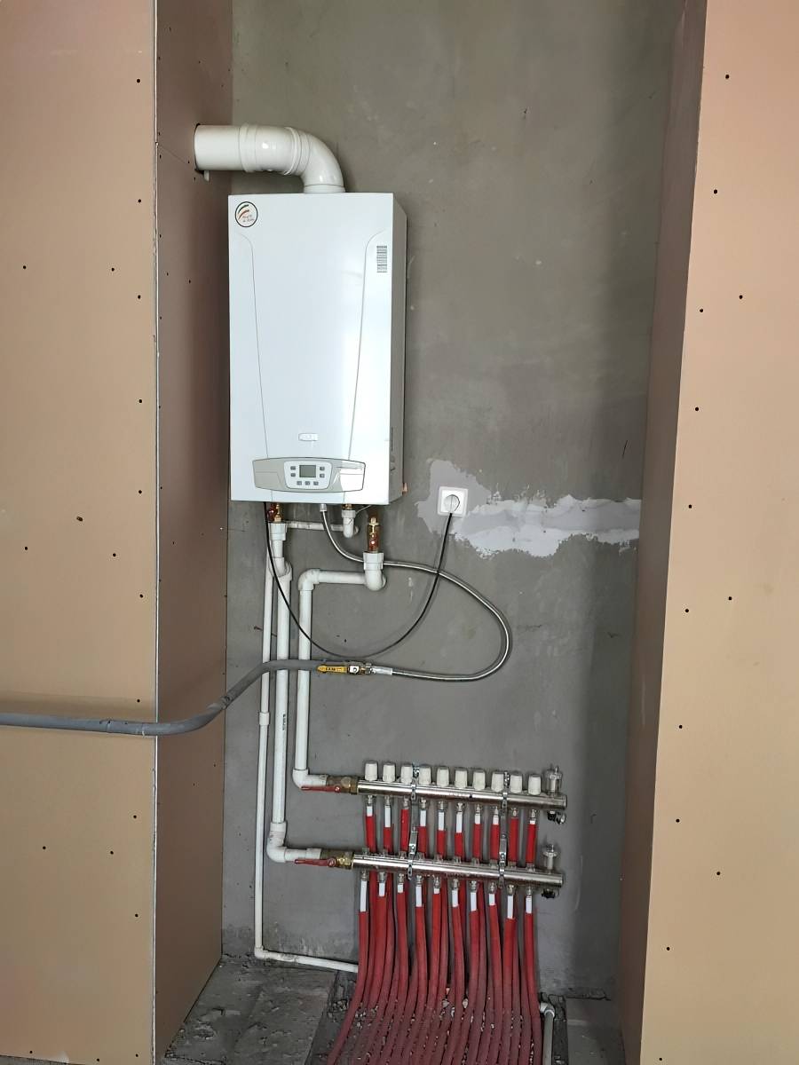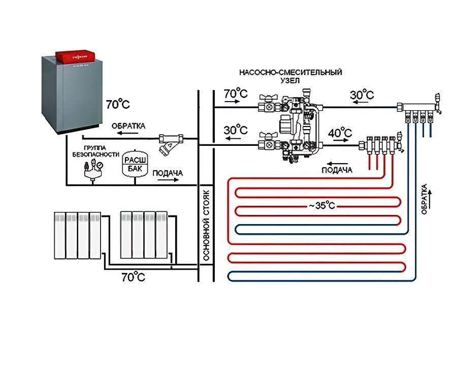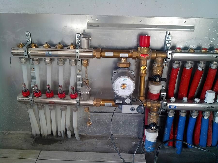 - На одной из стен, рядом с котлом, монтируется распределительный щиток с насосом и гребенками.