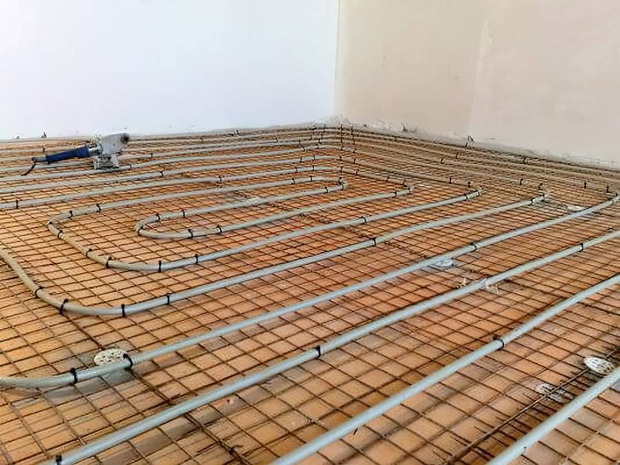 - В бетонную стяжку. Самый правильный по технологии вариант. Уложенные в пространство под полом, трубы заливаются песчано-цементной смесью с добавлением пластификаторов, что обеспечивает надежную защиту труб от повреждений в результате механических повреждений и обеспечивает высокий коэффициент полезного действии всей отопительной системы. Прогреваясь, бетон, представляет собой равномерно разогретую поверхность, что обеспечивает комфорт жителей дома, так как отсутствуют не прогретые участки напольного покрытия;