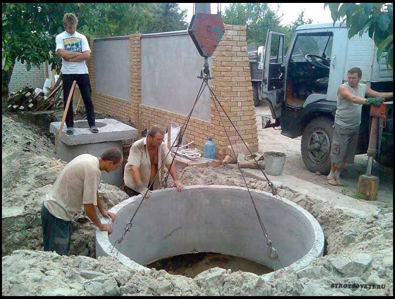 Монтаж. При установке готовой, пластиковой емкости, ее просто опускают на дно котлована. При установке ж/б колец, сначало дно засыпают песком или заливают бетоном. После этого, поочередно опускают кольца.