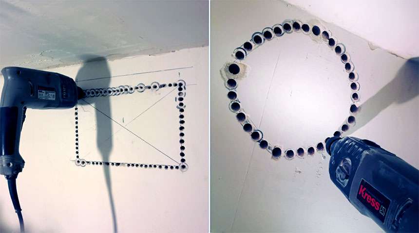 - Сверлящей коронкой перфоратора проходят слой отделки внутри помещения.
