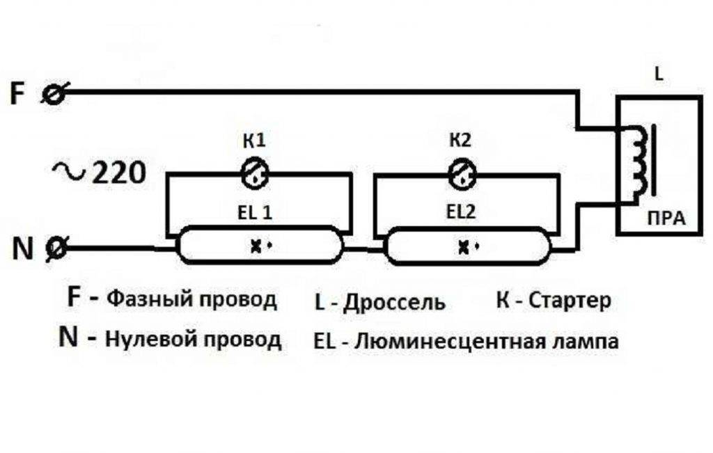 Классическая схема включения люминесцентных ламп