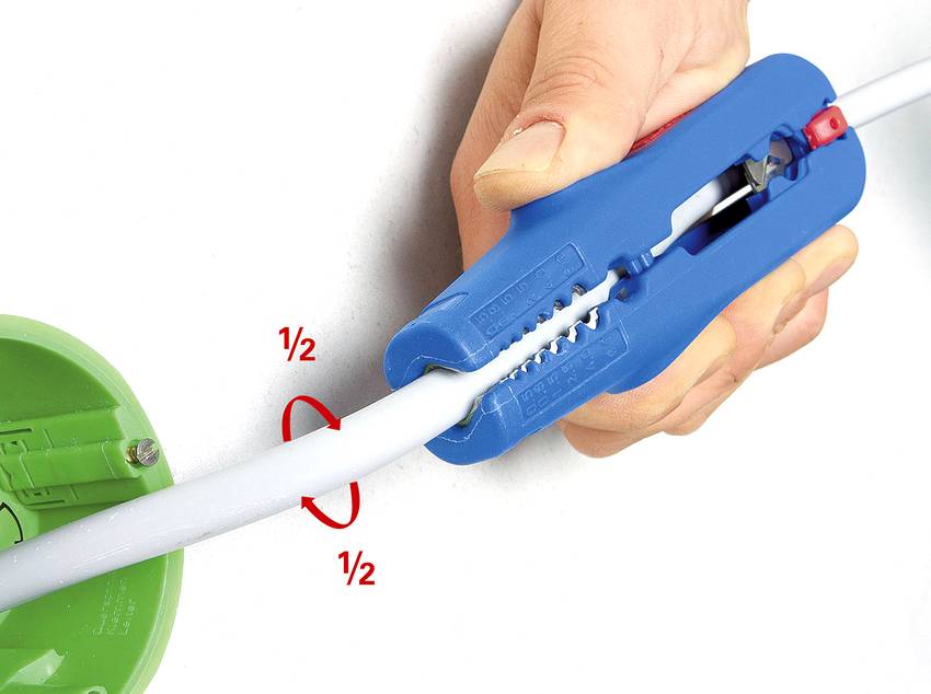 Для снятия изоляции важно, чтобы режущие части были направлены в противоположную от движения инструмента сторону. Таким образом ножи смогут врезаться в изоляцию даже при незначительном нажатии