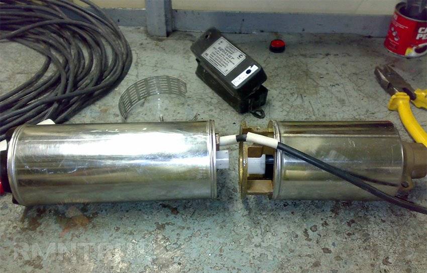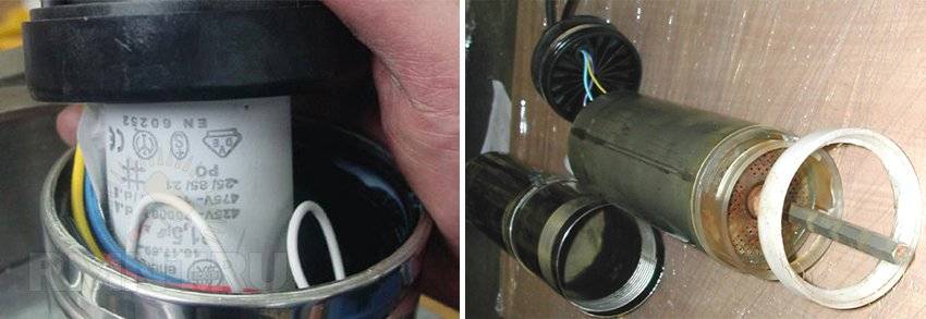 В насосах монолитной конструкции двигатель нужно выдавить из стакана, нажав на отвод подключения отходящего трубопровода при снятых крыльчатках. В штоковых насосах моторная часть отсоединяется при расстыковке двух половин, в шнековых — после снятия рабочего винта. Во всех случаях к внутренностям двигателя (конденсатору, соединительным клеммам) можно добраться только после снятия герметичной пробки. Она фиксируется 2–3 винтами на боковой поверхности гильзы и мощным стопорным кольцом. В некоторых разновидностях насоса пробка может требовать применения специального съёмника.