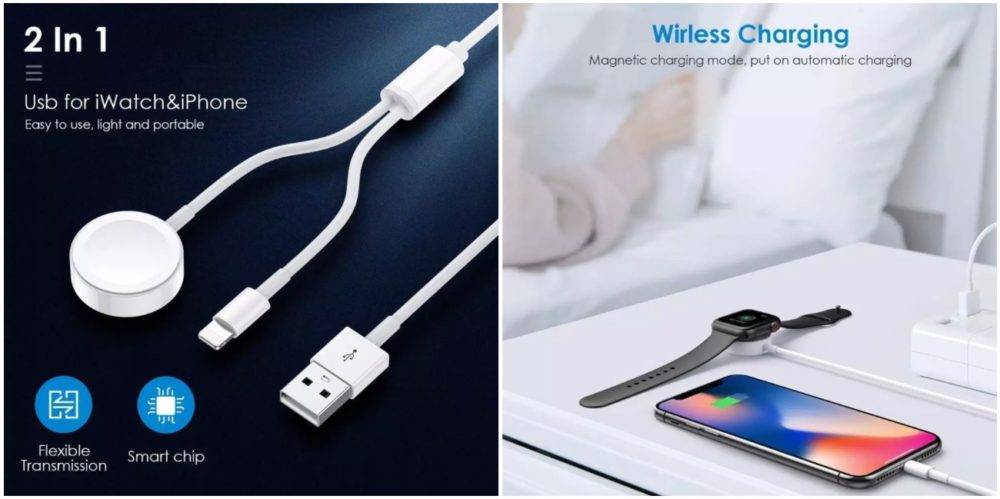 Если вы ищете кабель для зарядки Apple Watch, возможно стоит остановиться на этом. Благодаря особой конструкции вы можете заряжать сразу два устройства, часы и iPhone. Длина кабеля 1,5 метра, этого должно быть достаточно, чтобы покрыть расстояние между часами и блоком питания в розетке.