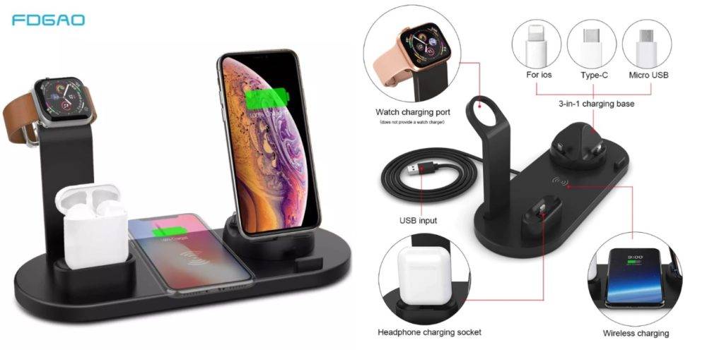 FDGAO 4-in-1 — это док-станция, которая позволяет одновременно заряжать iPhone, AirPods и Apple Watch по беспроводной сети. Его максимальная мощность составляет 7,5 Вт для iPhone, а для часов или беспроводных наушников вы можете использовать до 5 Вт. Эта зарядная док-станция совместима со всеми iPhone, поддерживающими беспроводную зарядку, и всеми версиями Apple Watch, включая новую серию 6.