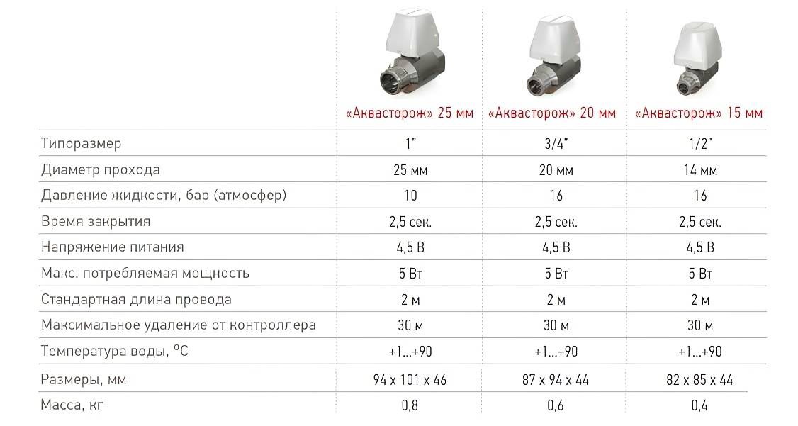 Выпускаются краны с электроприводом для перекрытия воды Аквастоп в трех размерах — диаметром 15, 20 и 25 мм. Устанавливаться могут как в стояки холодной, так и горячей воды.