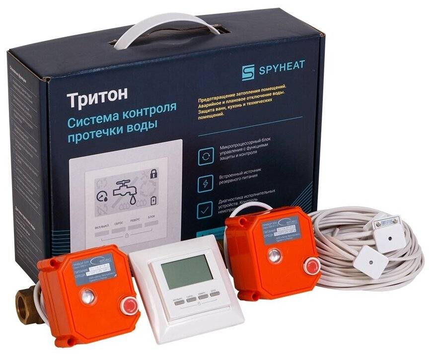 Данный комплект предназначен для труб диаметром 2¾. Как и все системы данного бренда, SPYHEAT тритон 20-002 отличается оперативным реагированием на возникновение протечки. Реакция занимает всего 1 секунду, а вода будет перекрыта в течение 5 секунд. Предусмотренное оповещение о ситуации в виде звукового и светового сигнала – значительное преимущество данного комплекта.