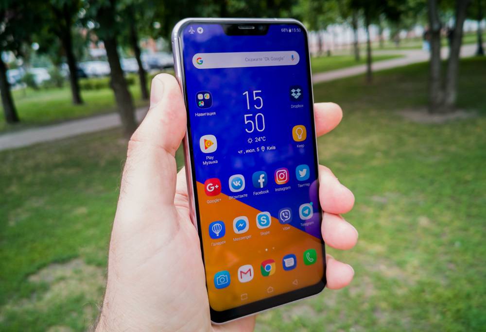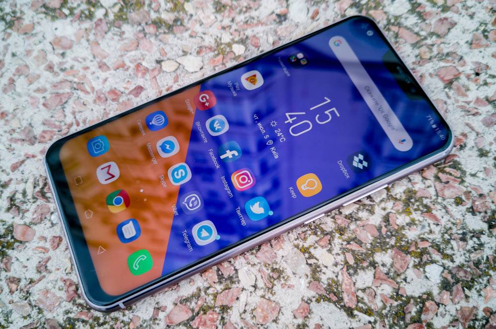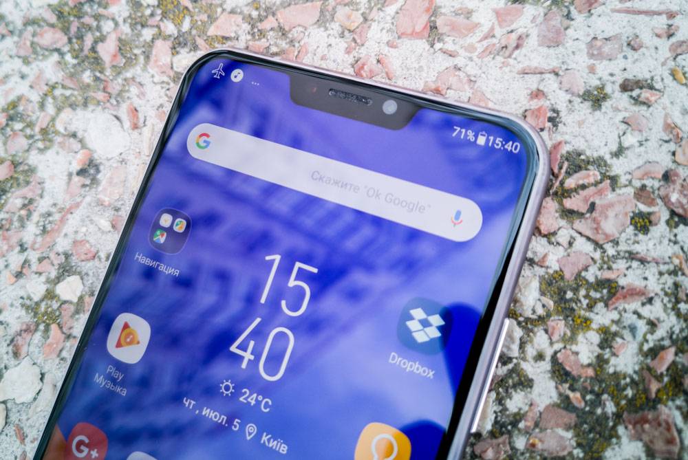 ASUS ZenFone 5z ZS620KL оснащается IPS-матрицей с диагональю дисплея 6,2 дюйма при разрешении 2246×1080 и нестандартных сторонах 19:9. Дополнительно в верхней области присутствует вставка. В целом, наблюдается полноценное следование трендам. Несмотря на определённую непривлекательность наличия отступов в рабочем пространстве для значительной части пользователей, подобные решения продолжают распространяться. Стоит отметить опцию маскировки, которая переводит цвет строки состояния в чёрный оттенок и, сливаясь, образует аккуратную полосу, однако края сверху остаются острыми вместо закруглений.